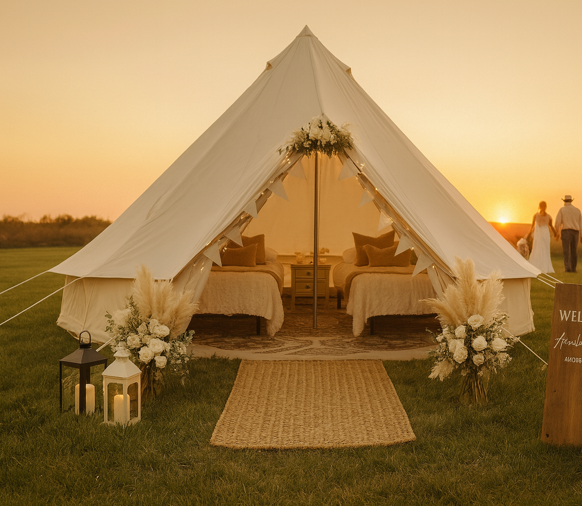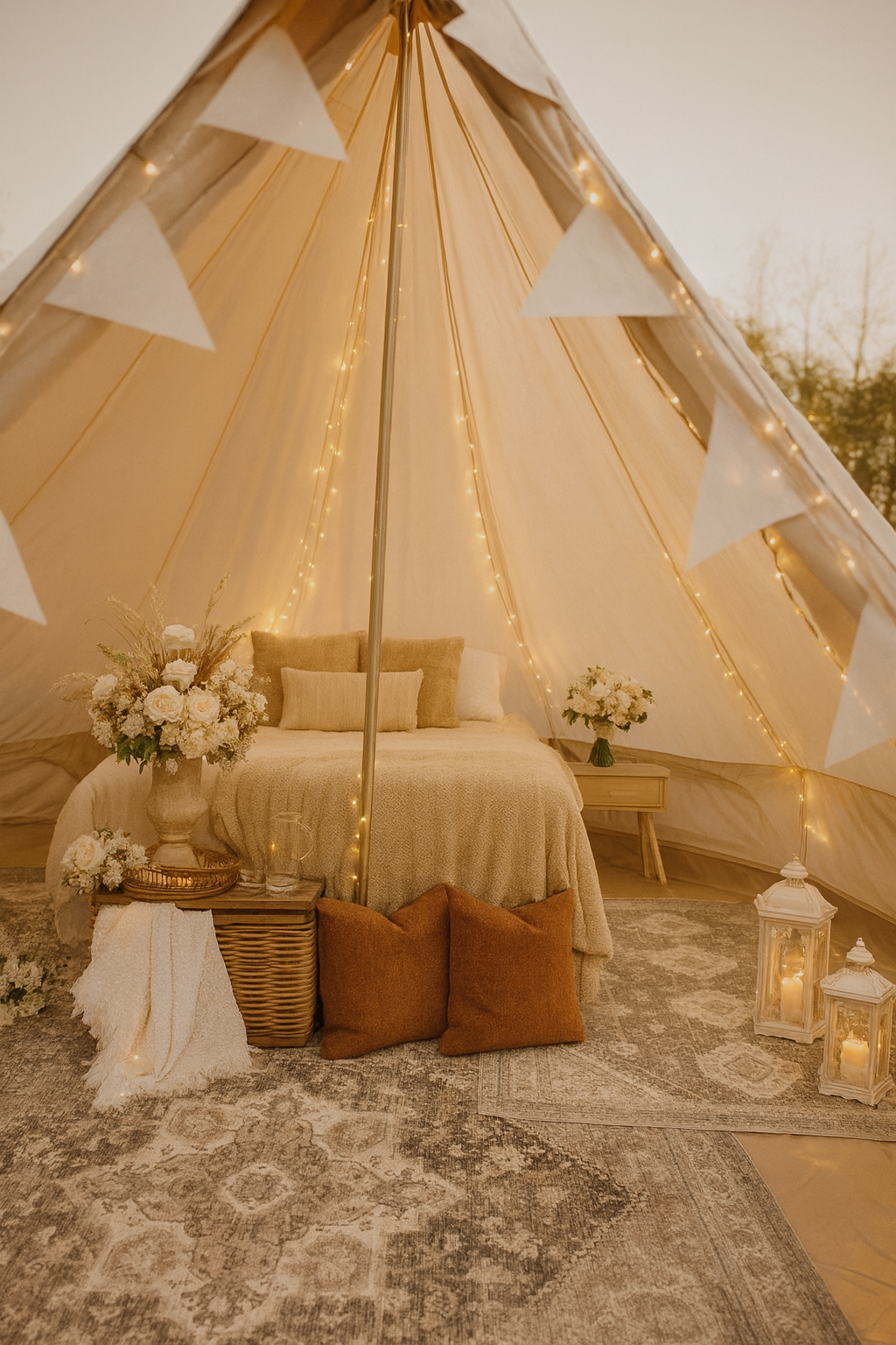 Avec leur ambiance bohème-chic, nos tentes transforment n’importe quel espace en un cocon unique, où confort et magie se rencontrent pour créer une expérience inoubliable.